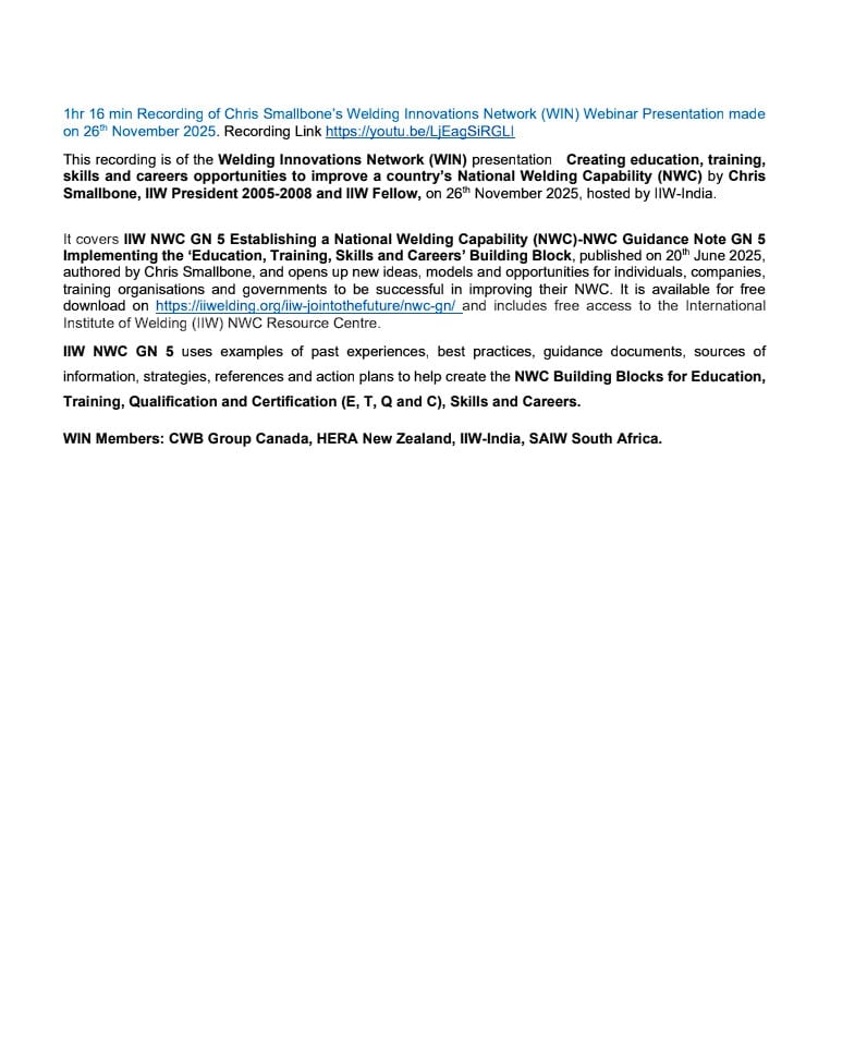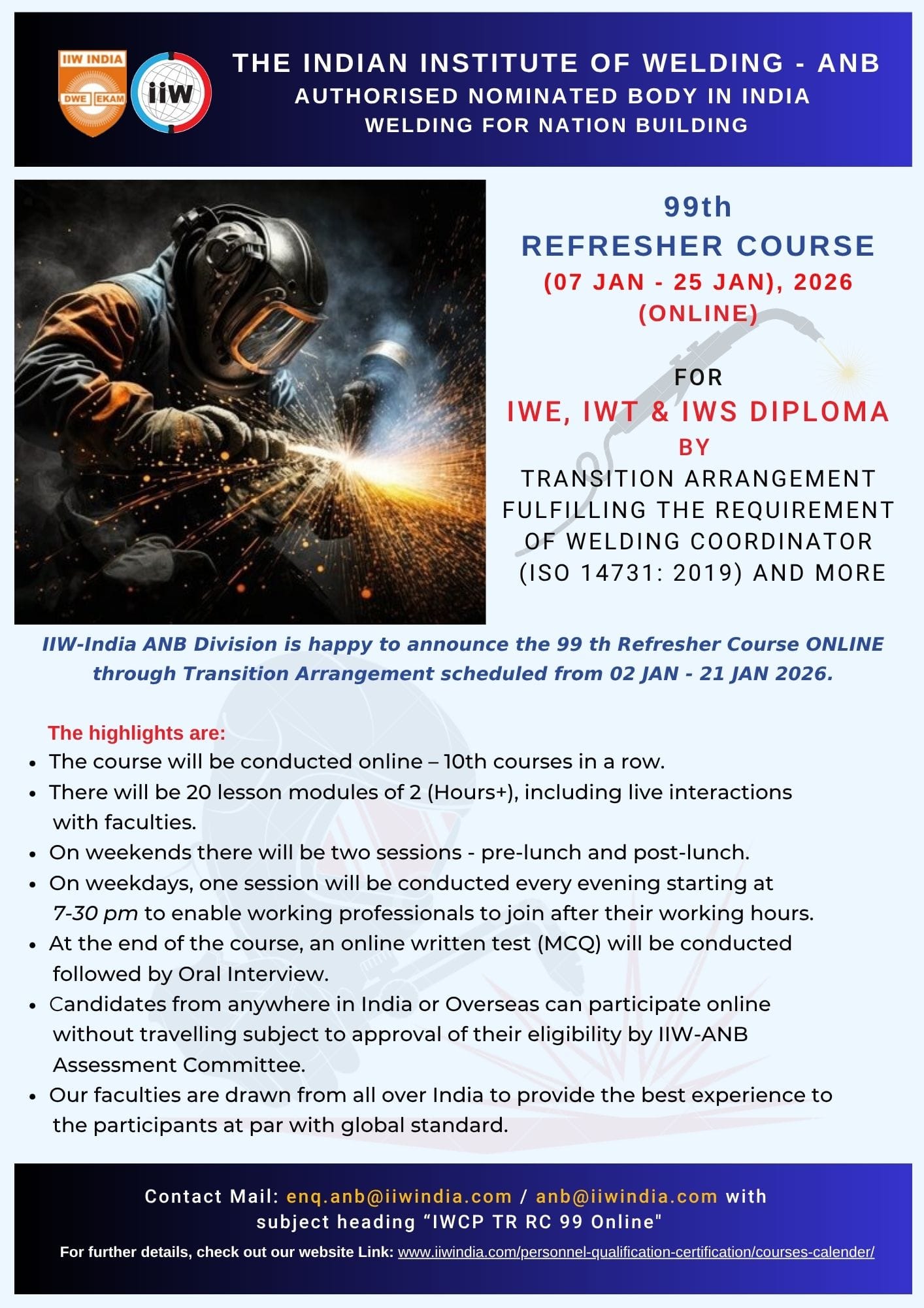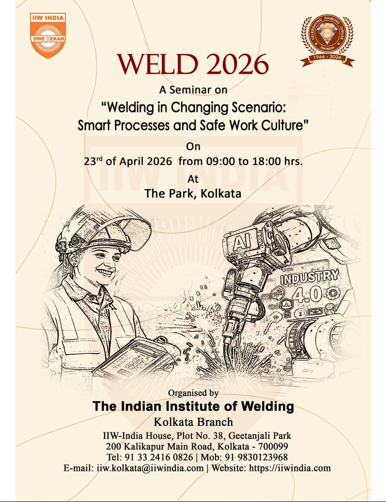 The Indian Institute of Welding (IIW-India) is a premier professional body of welding fraternity, devoted to the promotion and advancement of welding science and technology. It was established on 22nd April 1966, with its registered office at Kolkata. Presently IIW-India is having 14 branches and several Students’ Chapters, spread all over India. It has more than 4500 members including around 150 industries as Industrial Corporate Member. The Institute publishes Indian Welding Journal, which has technical research papers of high standards and published quarterly along with a specific section of American Welding Society (AWS). IIW-India is the responsible member society of the International Institute of Welding in India and has acquired the status of Authorised Nominated Body (ANB) to award internationally accredited professional Diplomas such as International Welding Engineer (IWE), International Welding Technologist (IWT) etc., and also acquired the status of Authorized Nominated Body for Company Certification (ANBCC) to certify Industries as per ISO 3834. The Institute also conducts its own National Welding Training & Certification Scheme (NWTCS) and National Welding Inspectors’ Certification Scheme (NWICS) through Authorised Training Institutes. It is also associated with educational institutes as Knowledge Partner and with Sector Skill Councils as Assessing Body. The motto of IIW-India is ‘Welding for Nation Building’.